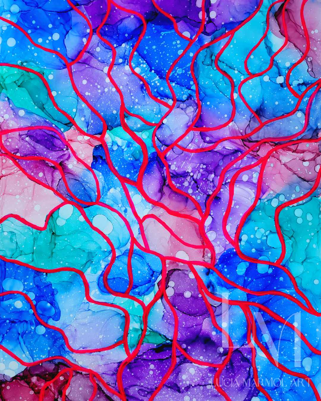 This original alcohol ink abstract painting features pink, blue, teal, and purple alcohol inks along with acrylic paint on white synthetic paper.