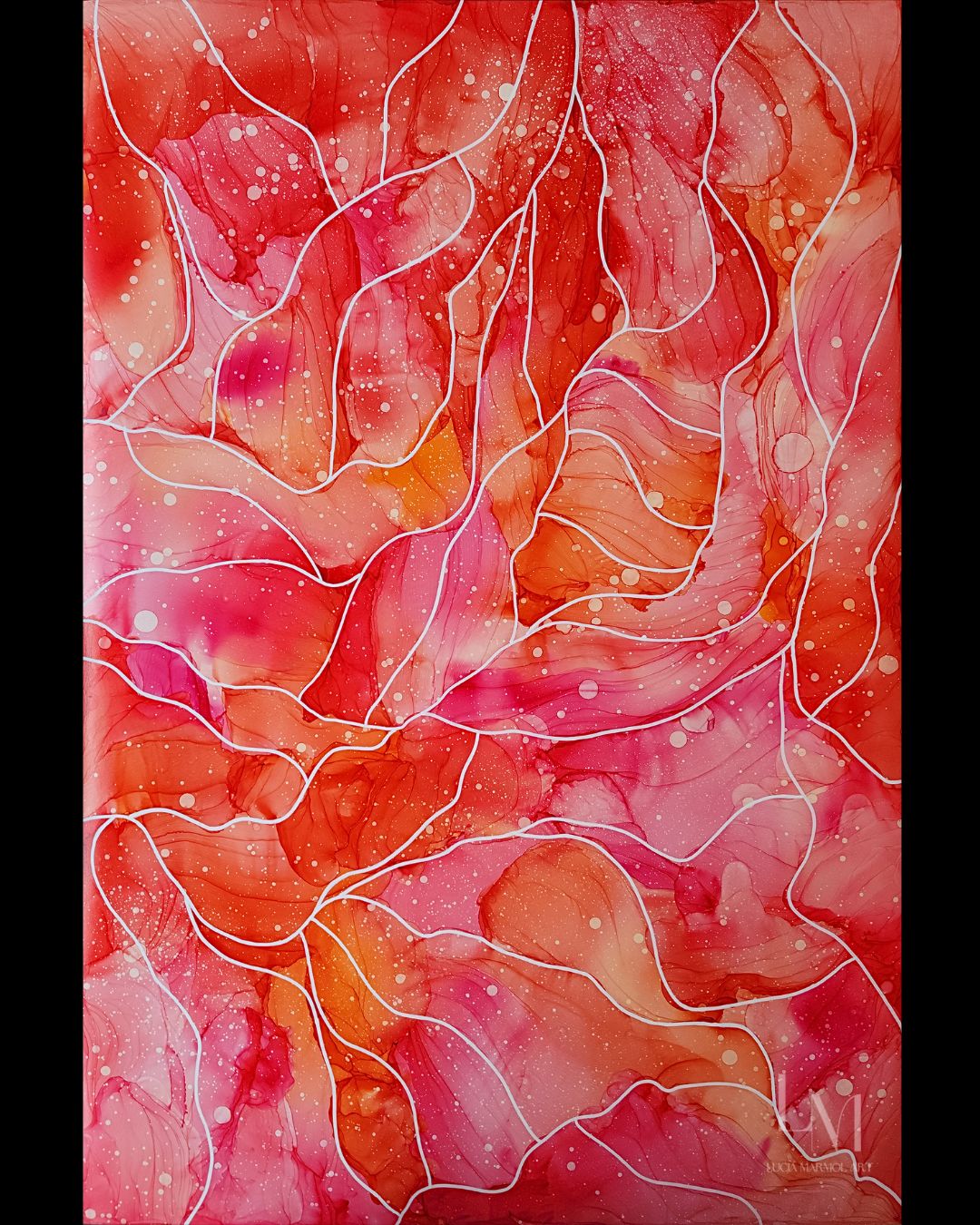 This original alcohol ink abstract painting features red and orange alcohol inks with white acrylic accents on white synthetic paper. View it "live" here
