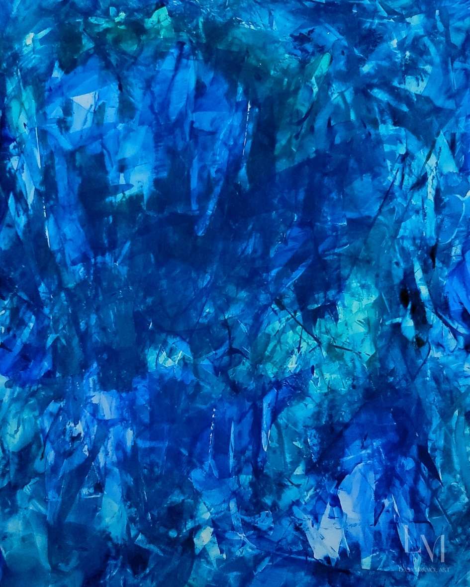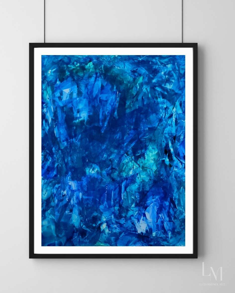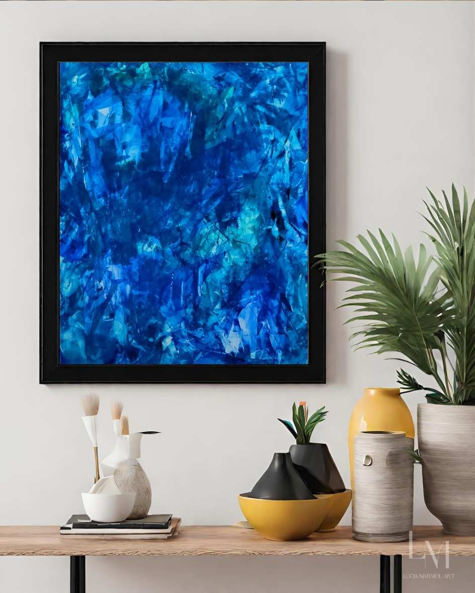 Captivated by the allure of the sea, I translated its beauty into this abstract ocean painting. This fluid art with ocean hues immerses you in a palpable sense of depth, evoking the feeling of being submerged beneath the waves. The calming shades of blue and teal instill a profound sense of peace and tranquility, while the abstract pattern adds a meditative touch to the composition.